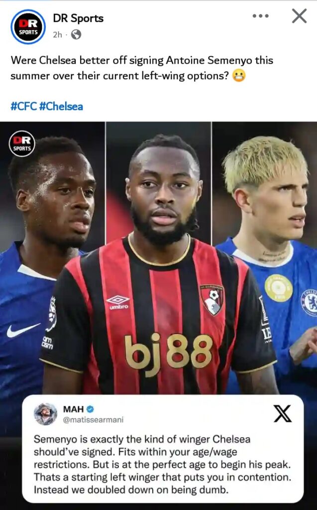 Some Chelsea supporters believe Antoine Semenyo would be a better tactical fit than the winger options currently at the club — arguing he offers more balance, physicality, and end product than Garnacho and new signing Jamie Gittens.