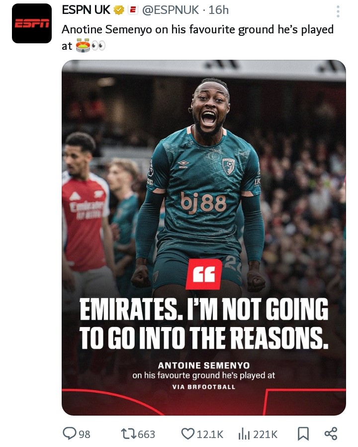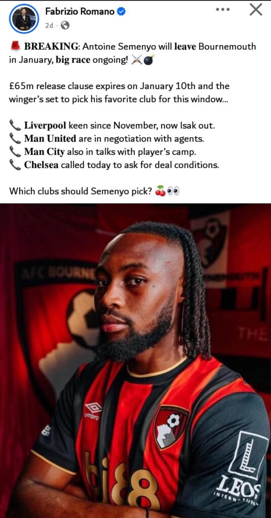 Reports linking Semenyo with Arsenal fandom began to surface after he described the Emirates Stadium as his favourite ground to play in, before pointedly refusing to explain why — a silence many interpreted as a deliberate attempt to avoid limiting his options while keeping potential moves to other clubs open.