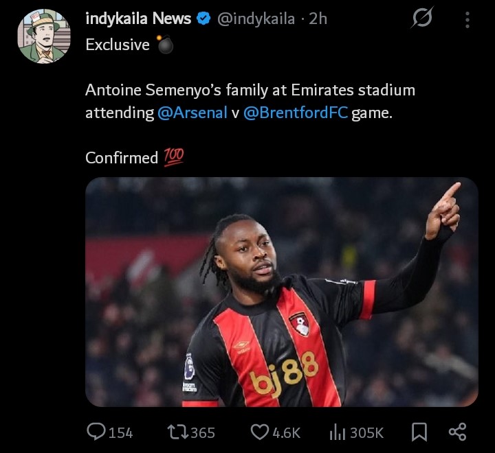 There were also reports suggesting that members of Semenyo’s family were in attendance at Arsenal’s match against Brentford at the Emirates Stadium.