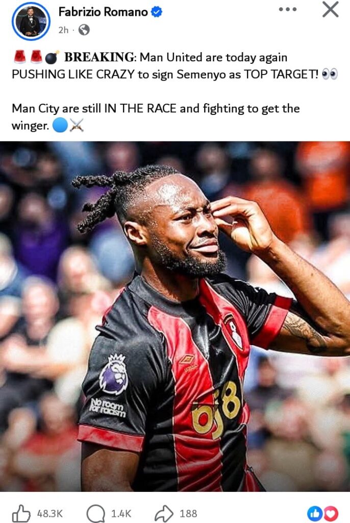 No. He has already joined Manchester City. However, Fabrizio Romano had earlier reported that Manchester United were interested in signing Semenyo, before the player ultimately chose to move to the blue side of Manchester.