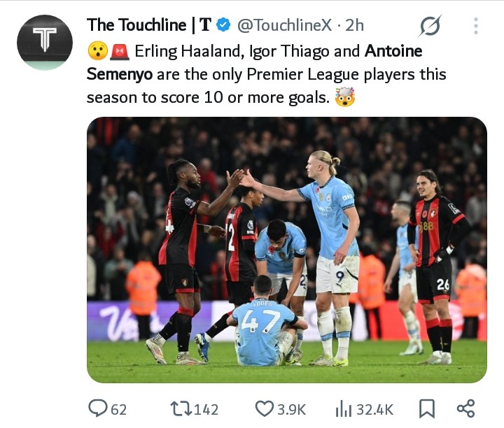 This season, only Haaland, Igor Thiago, and Antoine Semenyo have scored 10 goals or more, highlighting his immediate impact and the attacking firepower he brings to Manchester City.