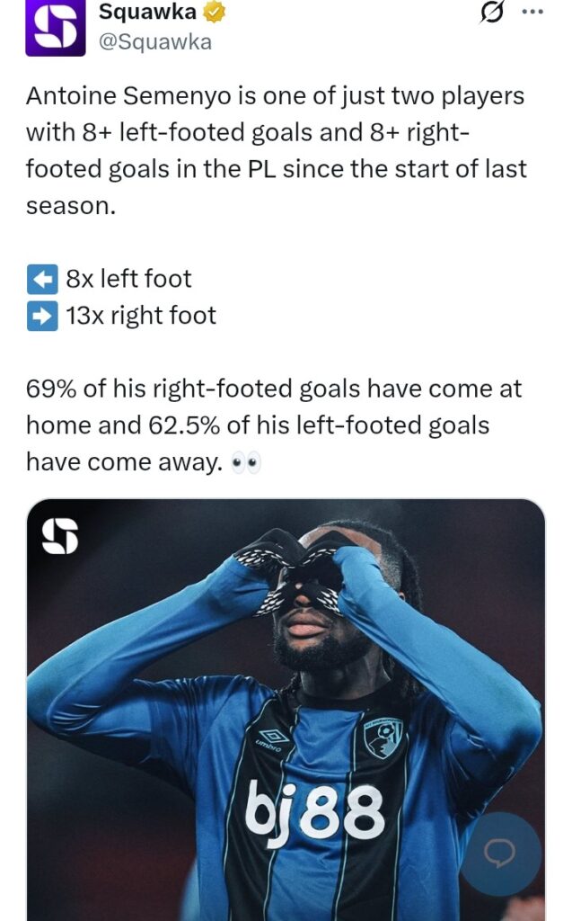 Captioned “How on earth did he do that”, the clip is arguably the clearest demonstration of Semenyo’s ability to use both feet at an elite level. Watch the moment here.