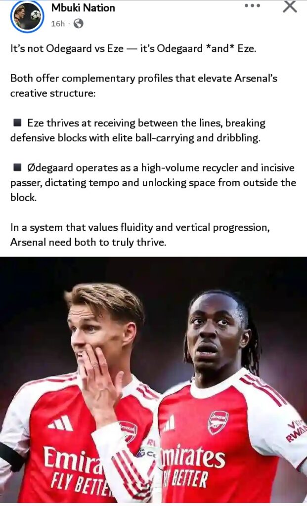 He also provides vital cover—and healthy competition—for captain Martin Ødegaard, who has been plagued by injuries this season. Some media reports even warned Ødegaard that Eze could replace him if his form drops.