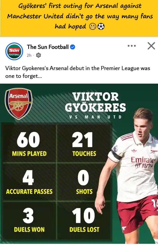 The Swedish striker registered just 19 touches, a remarkably low figure for a central forward in Arteta’s possession-based system, and failed to attempt a single shot, recording zero shots on target.