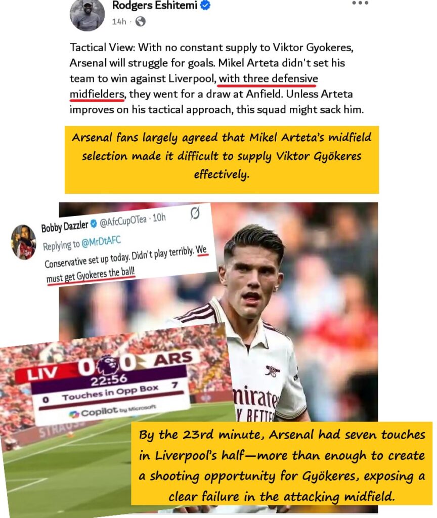 Tactically, Arteta entrusted Mikel Merino with the responsibility of supplying Gyökeres from midfield, hoping the Spaniard’s passing and late runs could unlock Liverpool’s defensive block.