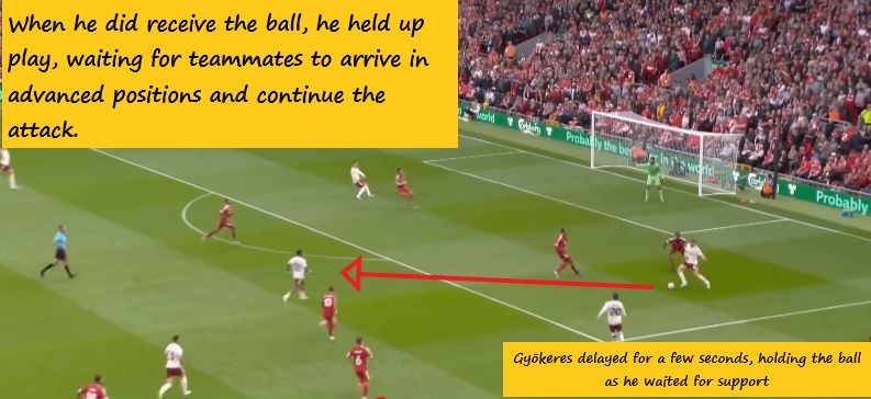 Here, Gyökeres holds up play effectively, waiting for support from Bukayo Saka as Arsenal work their way into Liverpool’s 18-yard box.