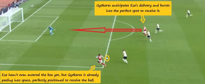 Here, Gyökeres anticipates Mikel Merino’s pass, times his run well, receives the ball, and holds up play while waiting for Bukayo Saka to arrive in support.