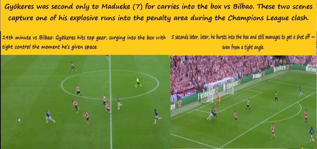 Against Athletic Club, Gyökeres showcased his ball-carrying ability, driving into dangerous areas and committing defenders, as shown here.
