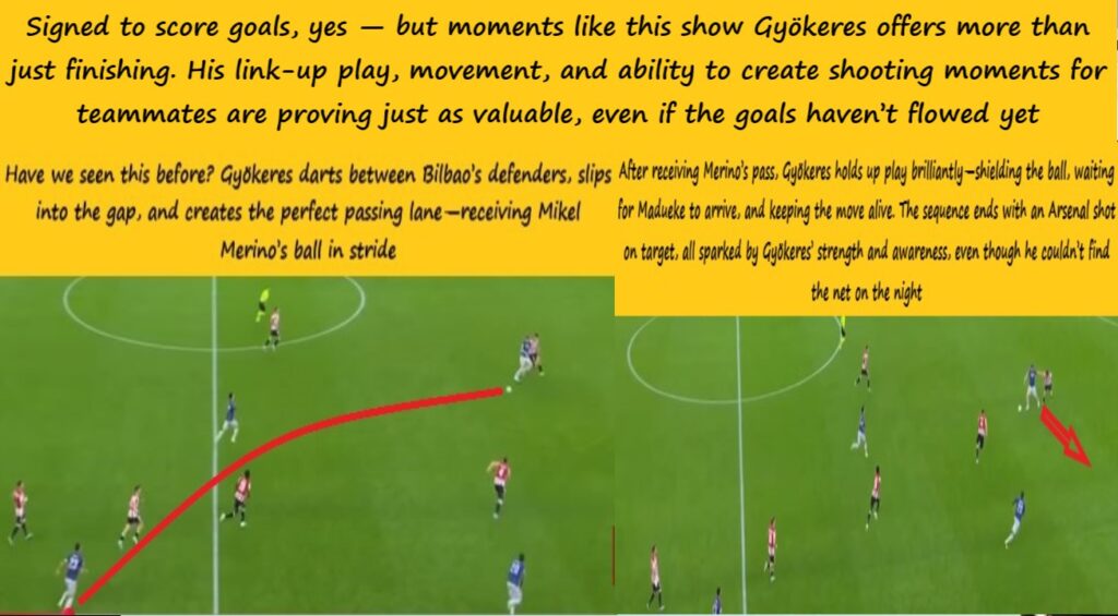 Against Nottingham Forest, Gyökeres showed sharp positional awareness — anticipating Eze’s delivery from wide, timing his run into the box, and finishing with a simple tap-in. This is exactly the movement Arsenal fans want from their No. 9.