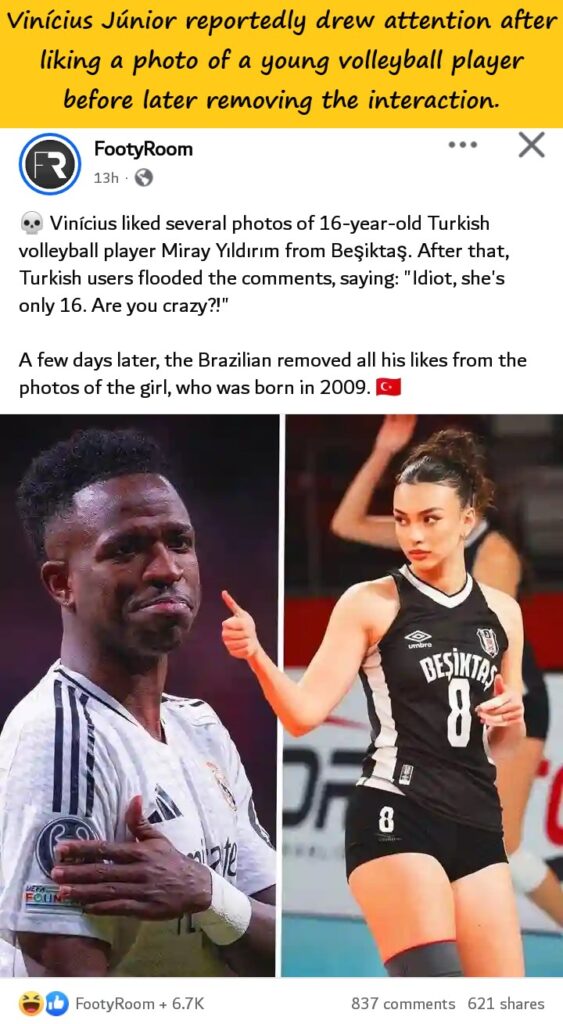 Online football fans erupted after Real Madrid winger Vinícius Júnior was reportedly seen liking several social media photos of a 16-year-old Turkish volleyball player, Miray Yildirim, sparking widespread debate across football Twitter, Instagram, and fan forums.
