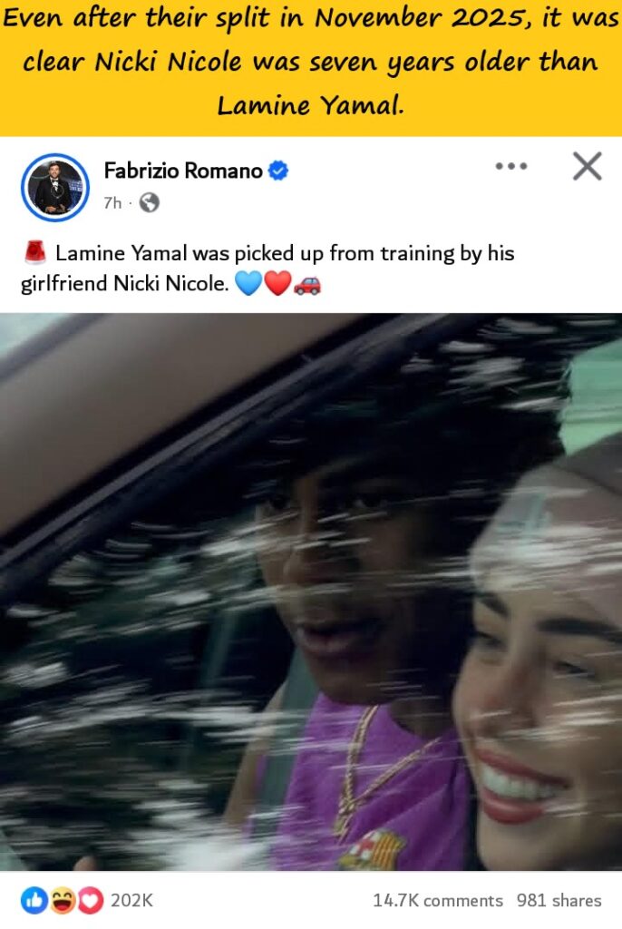 The situation became even more ironically amusing when Nicki Nicole came to pick Yamal up from Barcelona training, an everyday gesture that quickly turned into fodder for fans. Social media users and supporters couldn’t resist calling Yamal “the boy,” making the age difference painfully obvious — and further highlighting the unusual dynamic between the young football star and his older partner.
