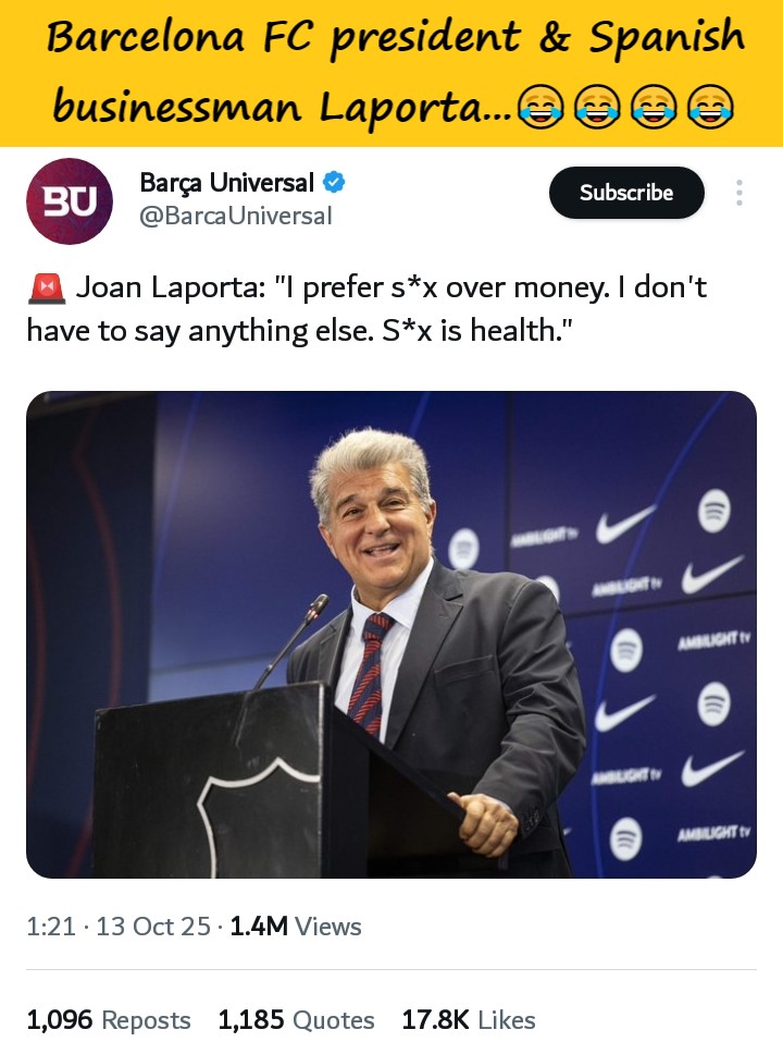 Laporta, a well-known Spanish businessman and president of Barcelona, raised eyebrows across football and business circles after stating that he prefers sex over money — a bold remark he made without offering further clarification. In fact, Laporta made it clear that he did not feel the need to expand or explain the statement, leaving the public to interpret it as they wished.