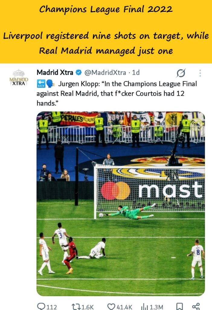 After the match, Klopp’s frustration was unmistakable, but so was his honesty. Speaking about Courtois’ extraordinary performance, the Liverpool manager famously joked that the Belgian goalkeeper had “12 hands.”
