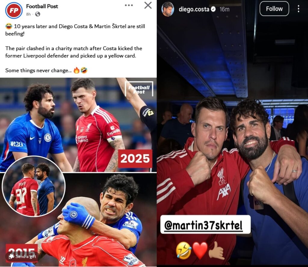 Škrtel, clearly unimpressed, pointed an accusatory finger at Costa. For a brief flash, both men appeared to forget the context — that this was a friendly exhibition match, played for nostalgia rather than points.