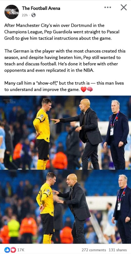 For nearly two minutes, Guardiola animatedly offered tactical advice, gesturing, explaining, dissecting positioning and decision-making. Groß stood there, fully engaged, listening intently, eager to absorb every detail — despite having just been on the receiving end of a heavy defeat.