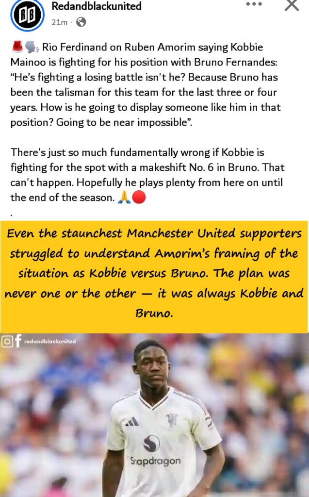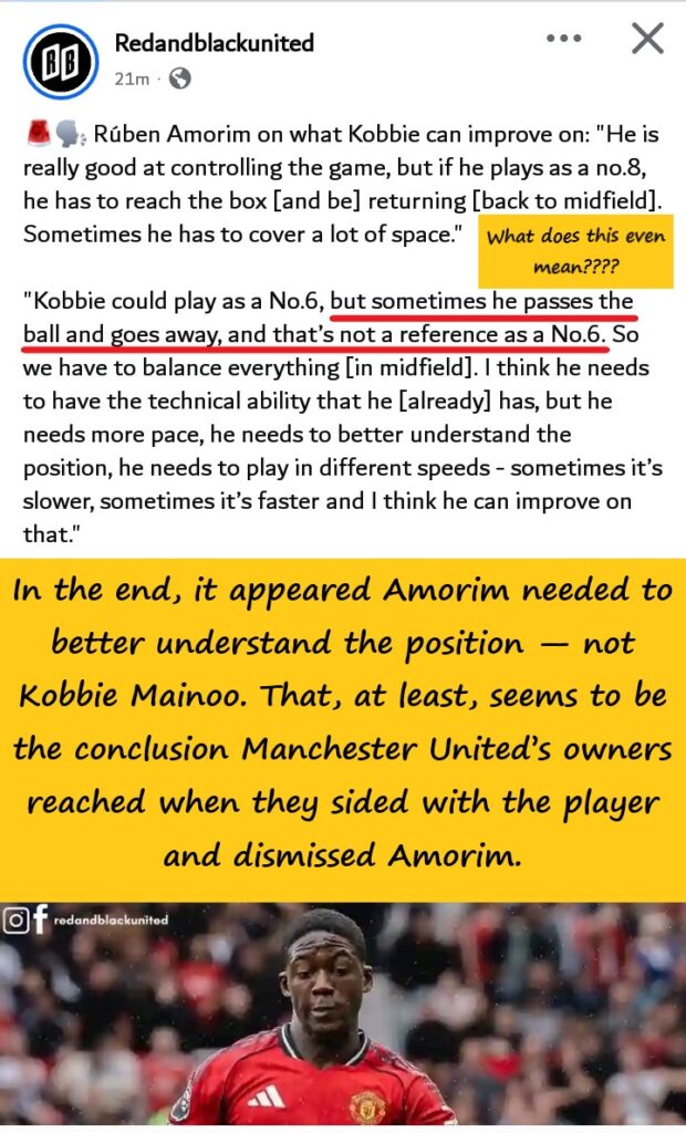 Amorim also claimed that Mainoo “passes the ball and goes away,” a criticism that fundamentally misunderstands the role of a defensive midfielder. A number 6 is supposed to maintain structure, retain possession, and protect the back line — all areas where Mainoo excels.