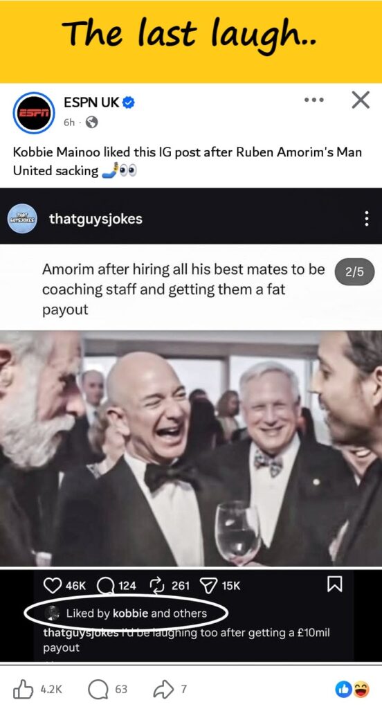 Many interpreted Mainoo’s reaction as quiet relief — and, to some, even subtle celebration — following the manager’s departure. Mainoo appeared to like an Instagram post poking fun at Amorim’s sacking, and to many fans, his subtle reaction felt like the natural response of a talented player who had been unfairly sidelined.