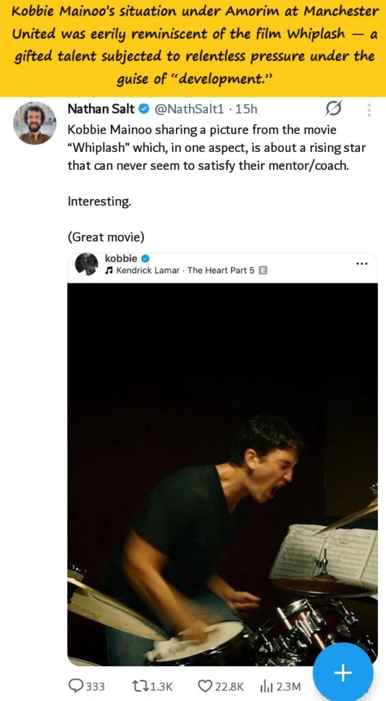 Concerns intensified when Mainoo shared an image from the film Whiplash — a story centred on young talent enduring extreme pressure without losing passion.